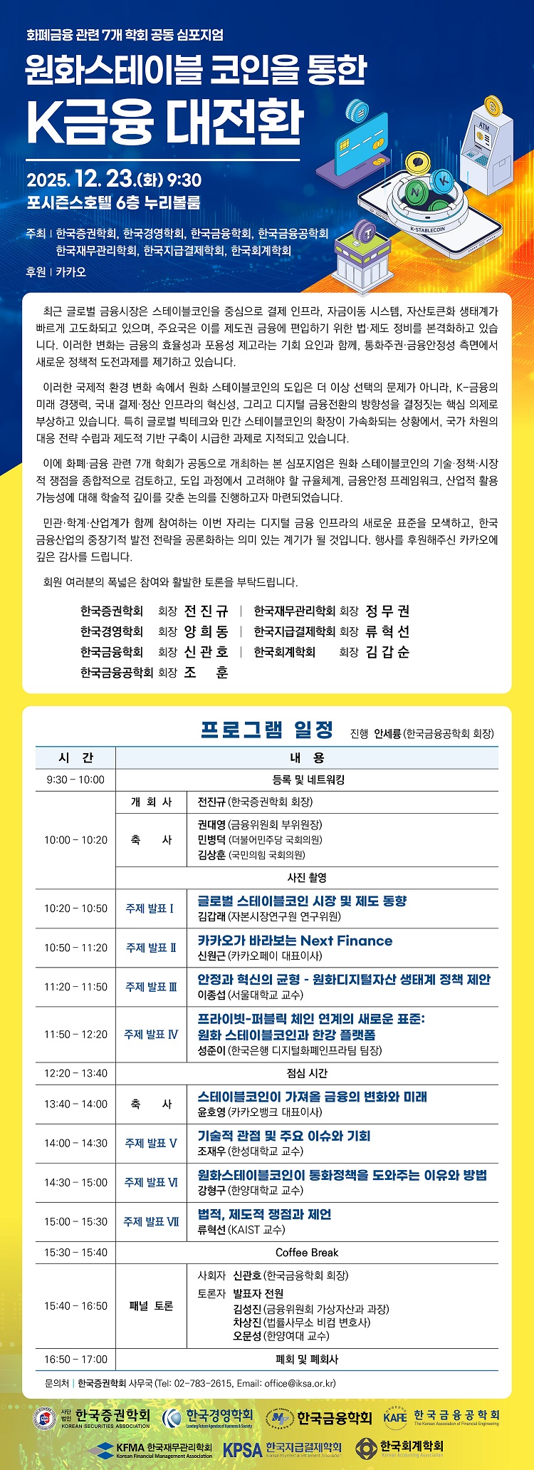 • 제목 [화폐금융 관련 7개학회 공동 심포지엄] 원화스테이블 코인을 통한 K금융 대전환 (12/23(화) 오전 9:30 포시즌호텔 6층 누리볼룸)