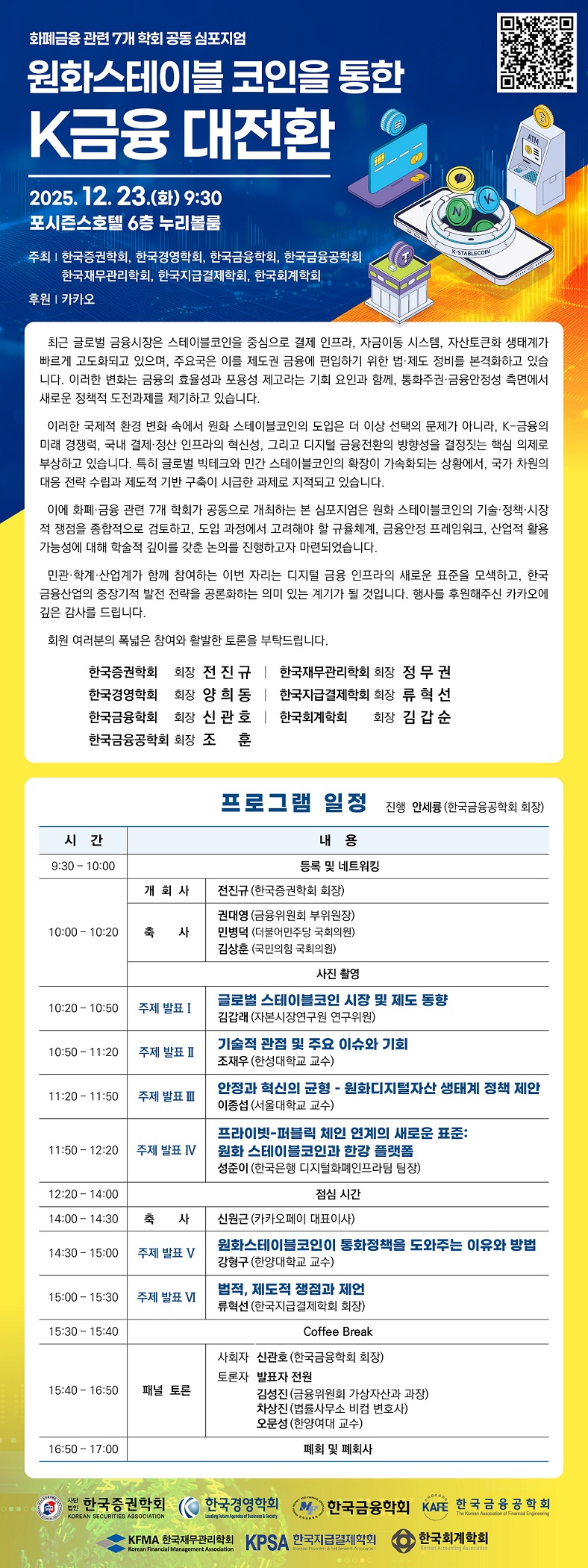 • 제목 [화폐금융 관련 7개학회 공동 심포지엄] 원화스테이블 코인을 통한 K금융 대전환 (12/23(화) 오전 9:30 포시즌호텔 6층 누리볼룸)