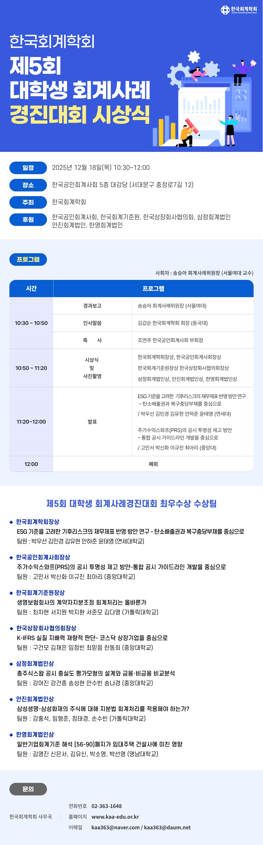 • 제목 제5회 대학생 회계사례 경진대회 (12/18(목) 10:30 한국공인회계사회)