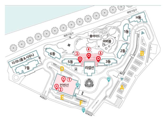| 7동 | 컨벤션 | 6동 | 5동 | 리셉션 | 3동 | 2동 | 1동 | H동 |
